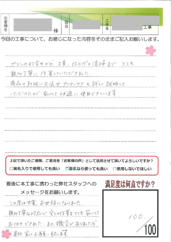 ヤマシンリフォームでは、工事完了・お引渡しの後に